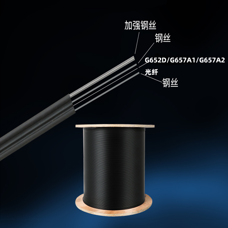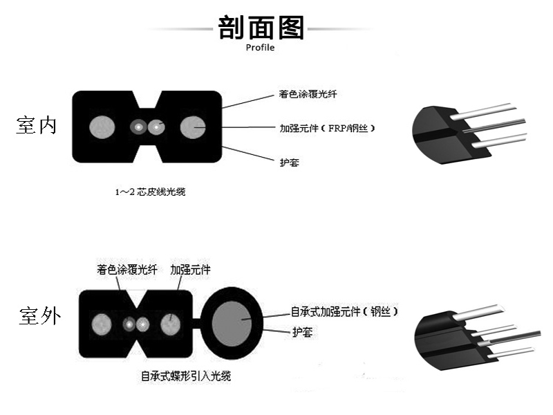 著色涂覆光纖加強元件色或彩色聚氯乙烯(PVC)或低煙無鹵材料(LSZH,低煙,無鹵,阻燃)護套而成、普通皮線光纜為標準8字型結構;
