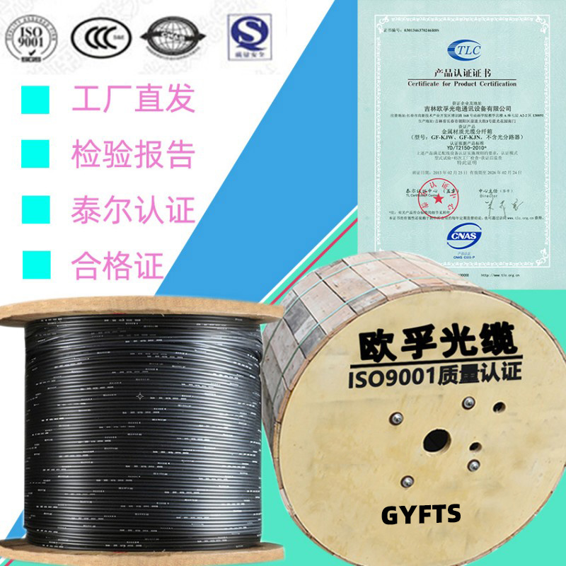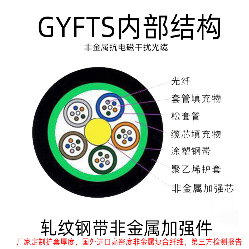 GYFTS光纜,層絞式結(jié)構(gòu),室外用、油膏填充、鋼帶縱包PE護套。采用層絞式結(jié)構(gòu),光纖套入由高模量聚酯材料制成的松套管中(光纖采用烽火及長飛的A 級光纖,保證傳輸性能優(yōu)良結(jié)構(gòu)性能穩(wěn)定)套管內(nèi)填充防水化合物。松套管 (和填充繩)圍繞非金屬中心加強芯(FRP)絞合成緊湊的纜芯,纜芯內(nèi)的縫隙充以水油膏。纜芯外擠制PE護套。